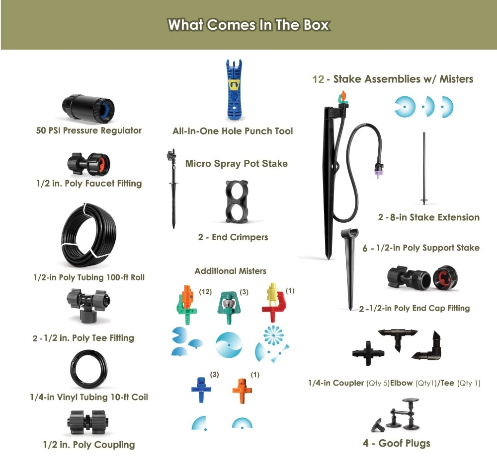 The kit includes a 50 PSI Pressure Regulator to help prevent against blowouts of Micro Sprays, 1/4-in connectors and 1/2-in Poly Tubing.